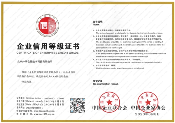 近日,中国企业联合会、中国企业家协会发布了2023年第一批信用企业名单。北京外研在线数字科技有限公司(以下简称:外研在线)凭借诚信经营、良好口碑和公众认可度,荣膺企业信用最高等级“AAA级信用企业”称号,这标志着公司的服务能力、产品质量、管理水平和信誉程度得到社会公认。