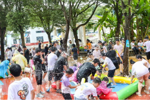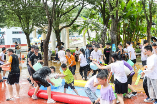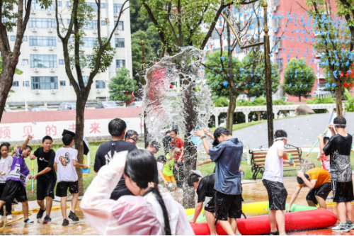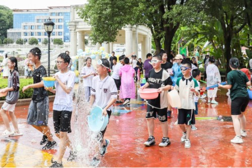 整场泼水活动气氛热烈,同学们跑着着、闹着、笑着,老师也纷纷参与到当中,一滴滴水珠盛满祝福,浸湿了师生的衣衫。