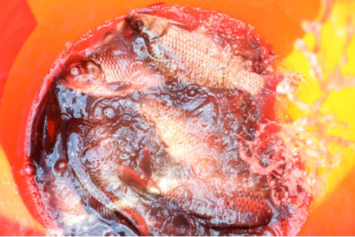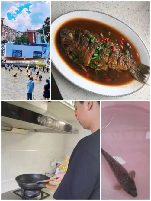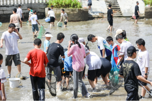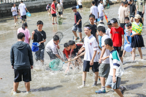 你瞧,同学微微屈身,鱼儿刚调皮地从水底探出头,下一秒就被他的小桶捕捉。