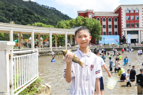 同学们在湖中游走,寻找鱼儿踪迹,脚边的触感真切,瞅准时机,果不其然,又抓获了一条小鱼。