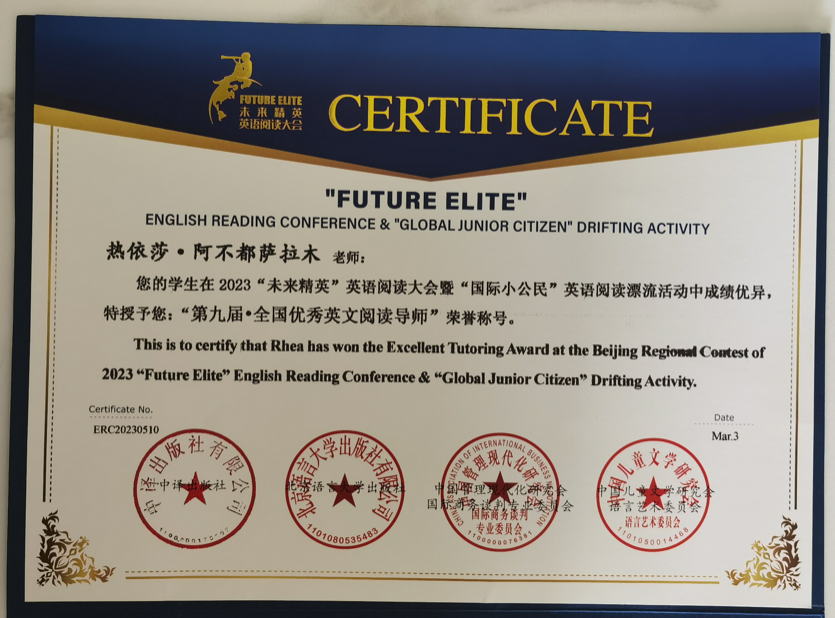 (组委会为希望学主讲颁发“全国优秀英语阅读导师”荣誉证书,以表彰其学员在本届大会取得优异成绩)
