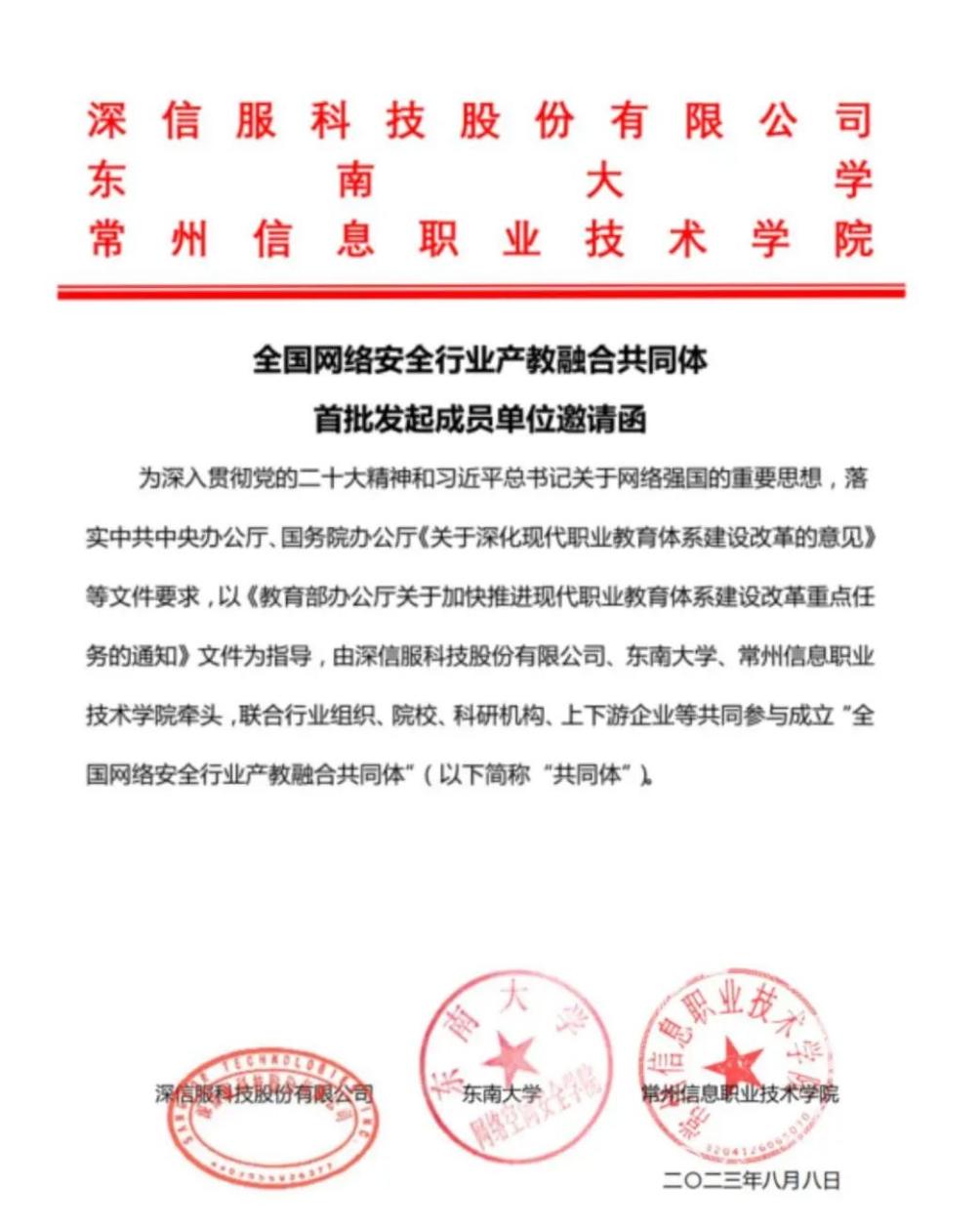 为深入贯彻党的二十大精神,落实中共中央办公厅、国务院办公厅《关于深化现代职业教育体系建设改革的意见》等文件要求,以《教育部办公厅关于加快推进现代职业教育体系建设改革重点任务的通知》文件为指导,由东南大学、常州信息职业技术学院、深信服科技股份有限公司牵头,联合行业组织、院校、科研机构、上下游企业等共同发起成立了“全国网络安全行业产教融合共同体”(以下简称“共同体”)。截至目前,共同体首批成员单位已包含157所院校,62家科研机构与企业单位。