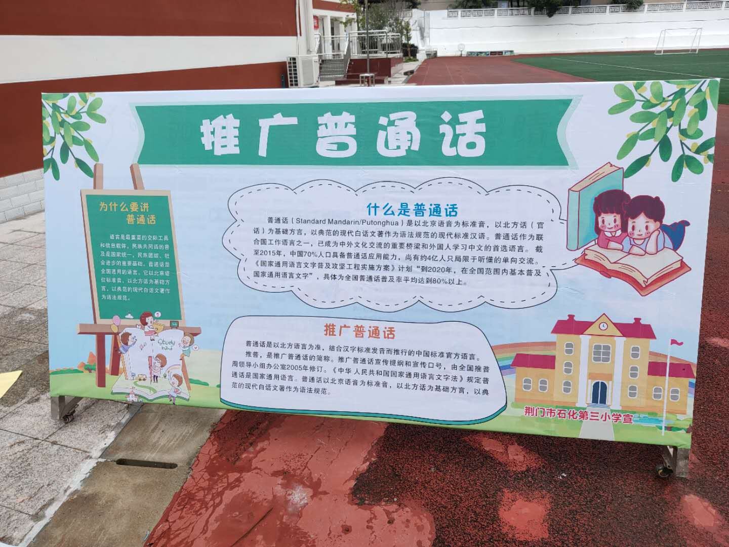 9月11日至17日是第26届全国推广普通话宣传周,石化三小结合实际情况,根据荆门市语言文字工作委员会办公室、荆门市教育局《关于开展荆门市第26届全国推广普通话宣传周系列活动的通知》精神,以《石化三小第26届“推普周”活动方案》为指导,全力动员、广泛宣传,以“推广普通话 奋进新征程”为主题,开展了一系列丰富多彩的活动。