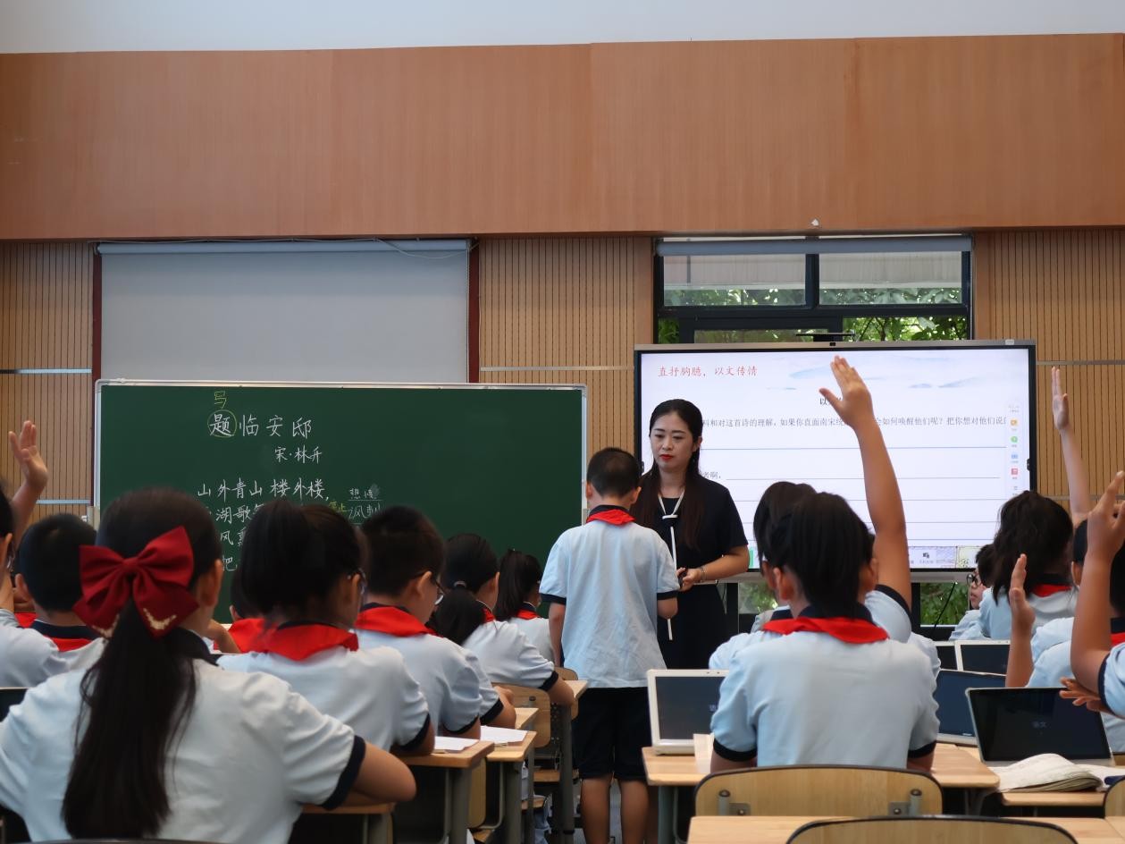 段洁老师以杭州的城市文化引入课题,带着学生在诗歌中游历西湖的“淡妆浓抹”“接天莲叶”,在“白沙堤”的“绿杨阴里”赞声连连......就在学生沉醉美景,醉心西湖文化之时,段老师话锋一转,引入了诗歌《题临安邸》。