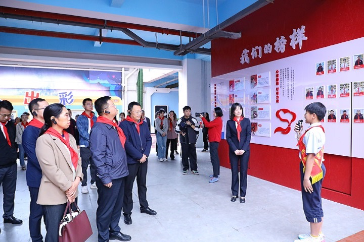 在红领巾讲解员带领下,与会人员观摩了学校红领巾科技争章项目(科技章)、红领巾五小项目(小创客)、红领巾小创客成果之一(画报展)等。鲜有特色的学校少先队活动室和争章园地吸引了前来的观摩人员。
