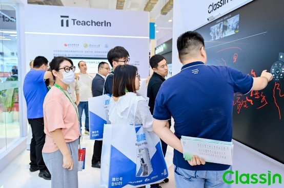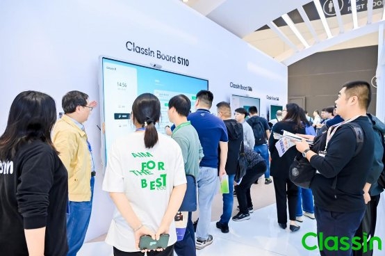 展会期间,翼鸥的ClassIn Board MAX 110(110寸智慧教学一体机),也吸引了众多参会者驻足了解。ClassIn Board MAX110是一款专为教育设计的“黑板”。它的使用非常简单,一指书写,两指翻页,手背是黑板擦,两指分开点是选择,三指以上是呼唤“飞盘”。记住这五个动作,老师就可以在上课中流畅使用。现场许多老师纷纷上手体验。