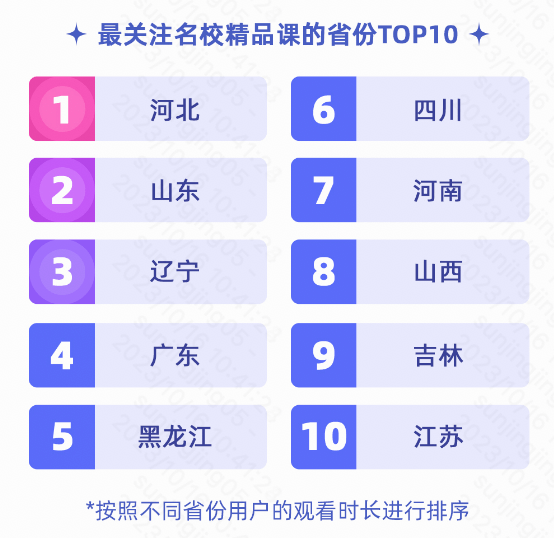 根据不同省份用户的观看时长,报告中也展现了一组有意思的数字。其中,在最关注名校精品课的省份中,从直播观看时长来看,河北、山东、辽宁、广东、黑龙江、四川、河南、山西、吉林、江苏位列TOP 10。