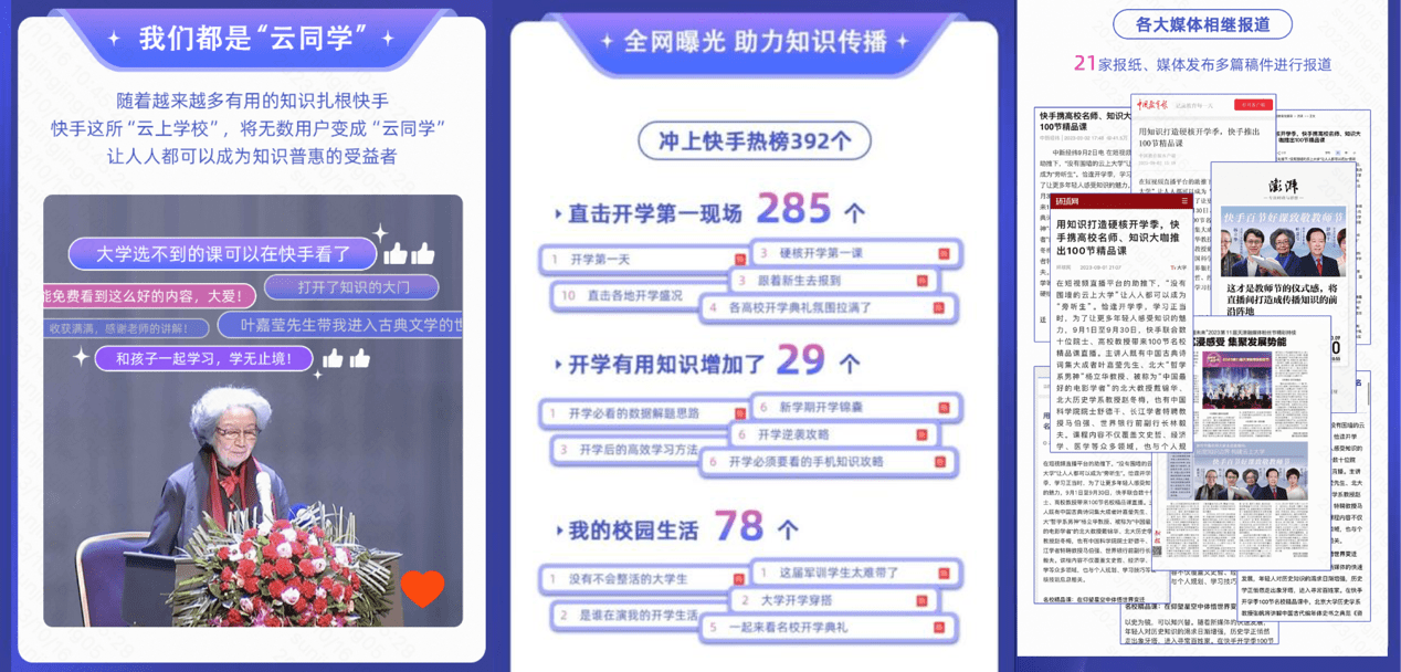 “大学选不到的课,终于可以在快手看了”、“一时间不知道先听哪个好了”、“听一节好课,终身受益”……在快手开学季名师精品课的直播间里,徜徉在知识星河里的人们,也用自己的方式表达着收获知识的喜悦。此外,快手开学季名师精品课相关话题冲上快手热榜392个,并被中国青年报、澎湃新闻等各大媒体相继报道,斩获全网高曝光,助力知识传播。