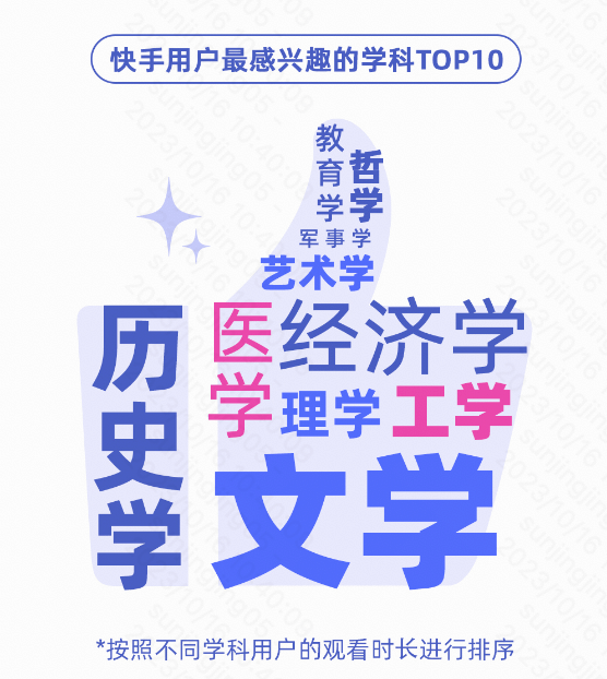 其中,快手用户最感兴趣的学科TOP10分别是文学、历史学、经济学、医学、工学、理学以及艺术学、哲学、教育学、军事学。