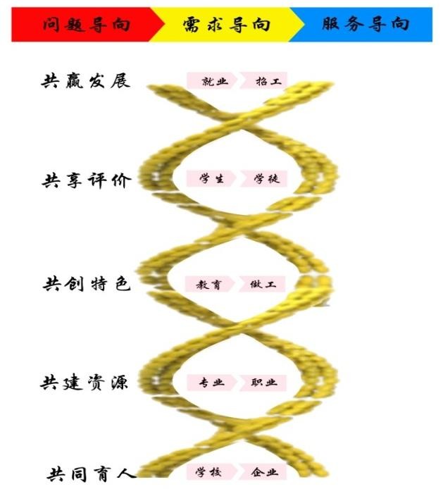 图2“三向五共”理念下校企“双主体双螺旋”产教融合模式