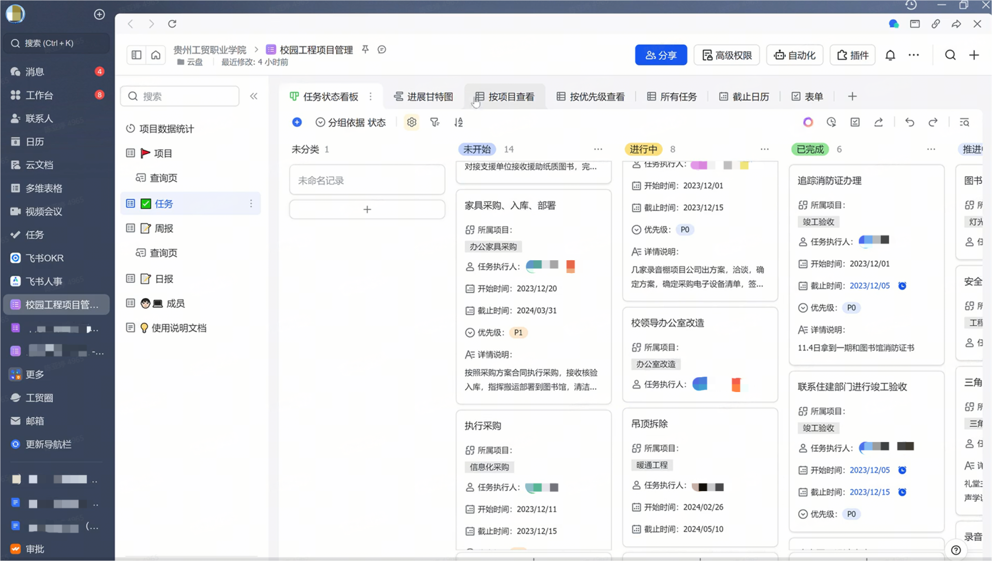 在校园工程的项目管理上,贵州工贸职业学院修改多维表格的模板,搭起项目页,汇总了从去年11月份开始学校进行的所有项目。每个项目下面分了很多子项目,比如图书馆就有竣工验收、办理产权证、办公家具采购信息。黄冠迪说:“它像是一个可视化的关系型数据库,能把很多表格叠起来,而且做到上下贯通。”