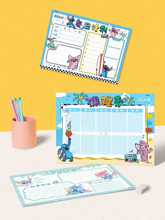 阳光活力课程/计划表、缤纷趣玩涂色卡和多彩奇妙作业纸是家庭学习与培养兴趣爱好的好帮手。小朋友在学习之余不论是想和史迪奇同框耍帅,又或是与安琪一起甜美可爱,史迪奇相伴相框都能满足。