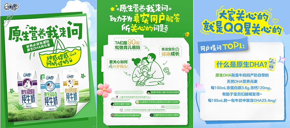 因此将“问答”作为溯源活动的切入口无疑成为了一个很好的沟通契机。QQ星收集了众多爸妈针对原生DHA纯牛奶的疑问,针对这些问题官方发布了「原生营养我来问」进行解答,希望能真正帮助到每位宝爸宝妈get有关儿童原生牛奶的知识。