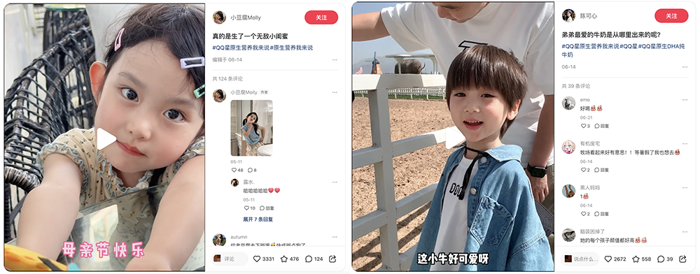 有了胡杏儿作为原生溯源之旅的铺垫,QQ星也借势小红书“妈妈能量俱乐部”IP影响力深耕线上内容矩阵,规模化扩大曝光——小红书官号@辣妈成长日记 全程播报现场亮点,QQ星与小红书深度定制的「原生营养我来说」创意H5和同名官方话题页一起构成了线上传播双阵地;@安伯斯与提妮@海龟硕士rui妈@Ada-博士妈妈林梓舒 等多位知名宝妈博主从“榜样萌娃”的成长日常为内容切入口,分享自己的养娃秘籍,传递并连接养娃人群和QQ星产生深度信赖,而QQ星也顺利成为评论区用户的讨论焦点,成为了许多家长心中儿童牛奶的优选。