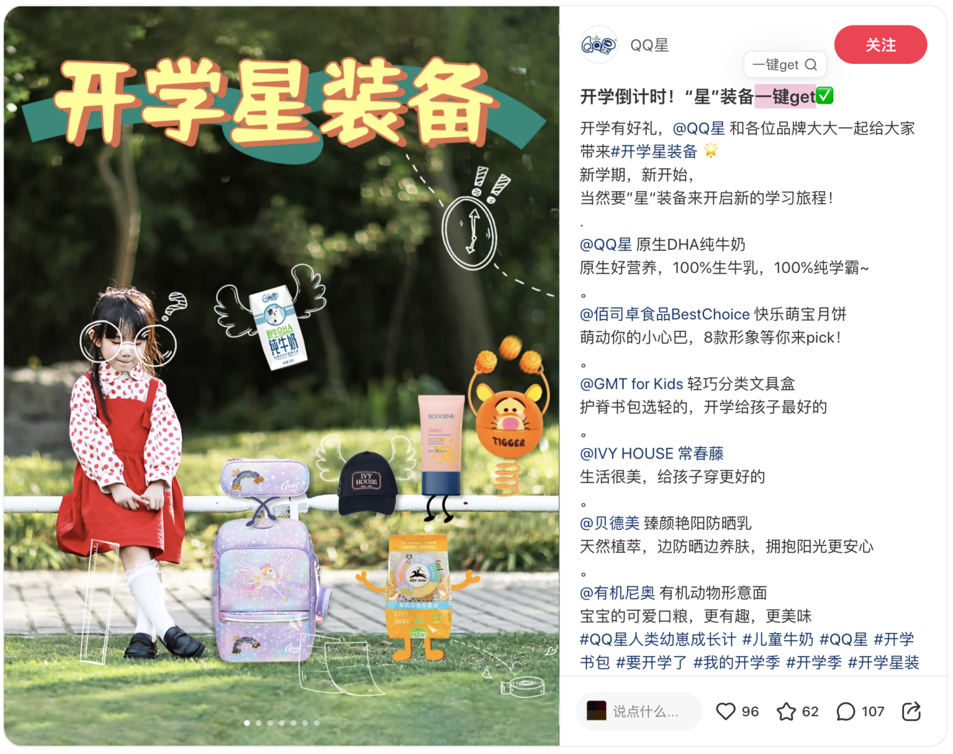 随着暑期结束,在即将到来的开学季,QQ星已开始进行前置布局,预热优质内容蓄水人群,从宝妈关注的开学季热门话题“开学分离焦虑”“开学运动会”等方向进行切入,并联动@GMT for Kids@IVY HOUSE 常春藤等儿童品牌送出好礼帮宝妈们一键get开学“星”装备,后续也将在活动期间,通过多场景运营实现高效种草及站内闭环。