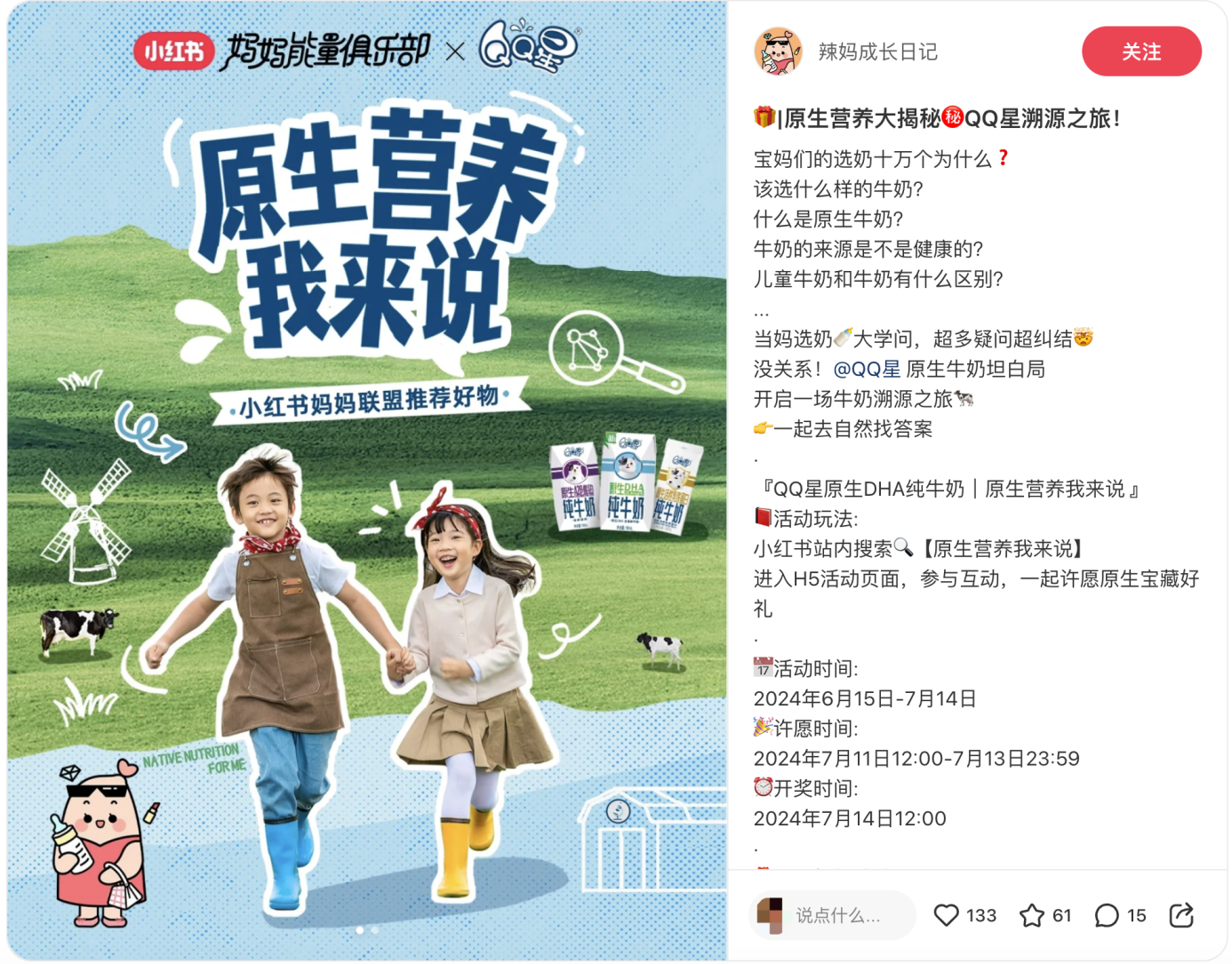 今年暑期小红书“妈妈能量俱乐部”特别联手中国儿童奶领军品牌QQ星共同开启了以“原生营养我来说”为主题的合作,聚焦儿童乳品领域,通过一系列活动加深家长们对于儿童原生营养知识的理解,在线赢得了小红书社区宝妈用户的高度认可。