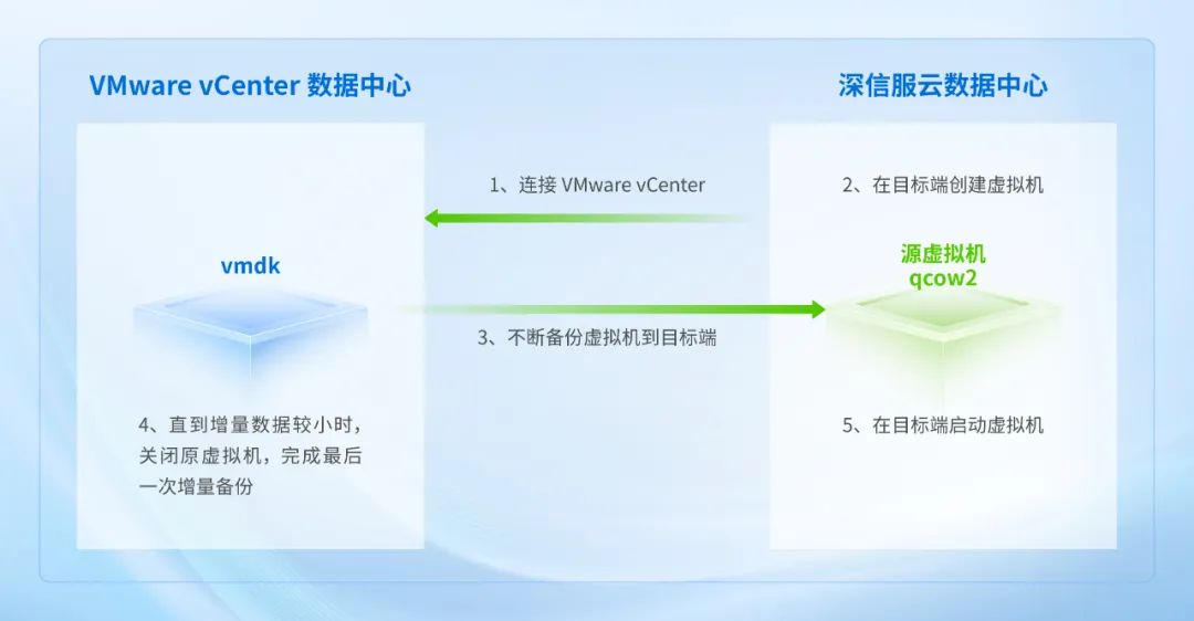利用先进的备份工具,采用增量备份方式,持续将VMware虚拟机的数据同步到深信服超融合云平台。这种方式既节省了资源,又保证了数据的实时性。