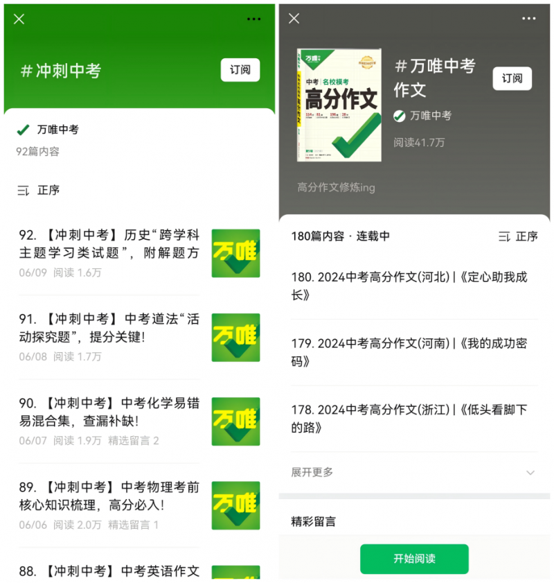 万唯中考公众号,以提升师生体验为目标,结合每个阶段的备考需求,推出重要核心栏目。如9-12月,每日推送一道万唯原创好题,帮助学生掌握新学知识;寒假期间,推出“30天逆袭挑战”等打卡互动栏目,助力学生复习预习;次年3-6月,发布理化生实验备考、热点主题作文素材、考前现代文阅读、中考真题抢先练等,帮助师生精准备考。其间,也会第一时间整理、发布最新中考政策及备考建议等。7-8月,新一届中考生的预习类内容也会准时上线。贯穿全年的语文英语“高分作文”栏目,以名校尖子生优秀范文和名师写作指导,助力学生持续积累,提高写作能力。万唯中考公众号每天定时推送,全年365天陪伴中考师生,以专业实用、贴心多样的备考内容服务师生。