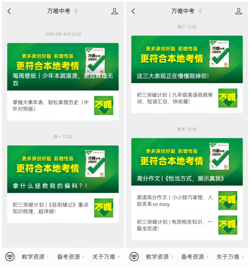 万唯中考公众号创设至今,持续策划并输出契合师生需求的专业化内容,切实帮助学生提升成绩,同时,每年组织用户调研,升级优化。目前,万唯中考公众号围绕“备考指导/方法”“知识资源”“中考政策”“心态调节/情感陪伴”四个核心主题,推送一系列高质量内容,全方位支持师生的学习和成长。