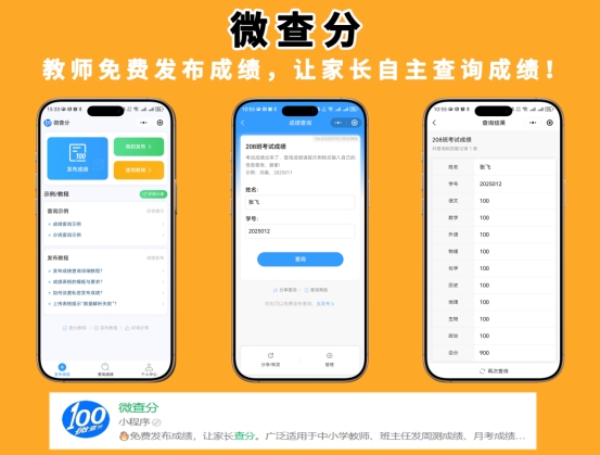 1、微信搜索“微查分”打开就能用;2、点击“发布成绩”去创建成绩查询系统;3、分享查询页面链接给家长,让家长查分;4、家长输入信息即可查询到成绩。