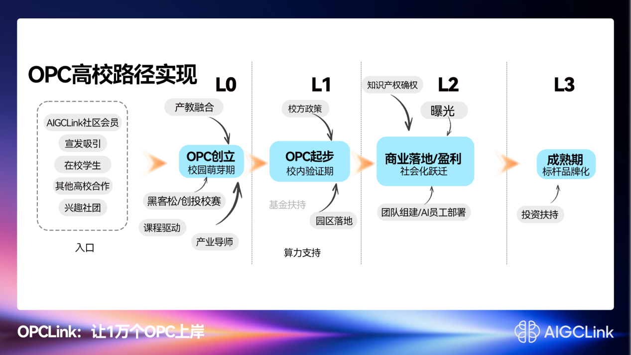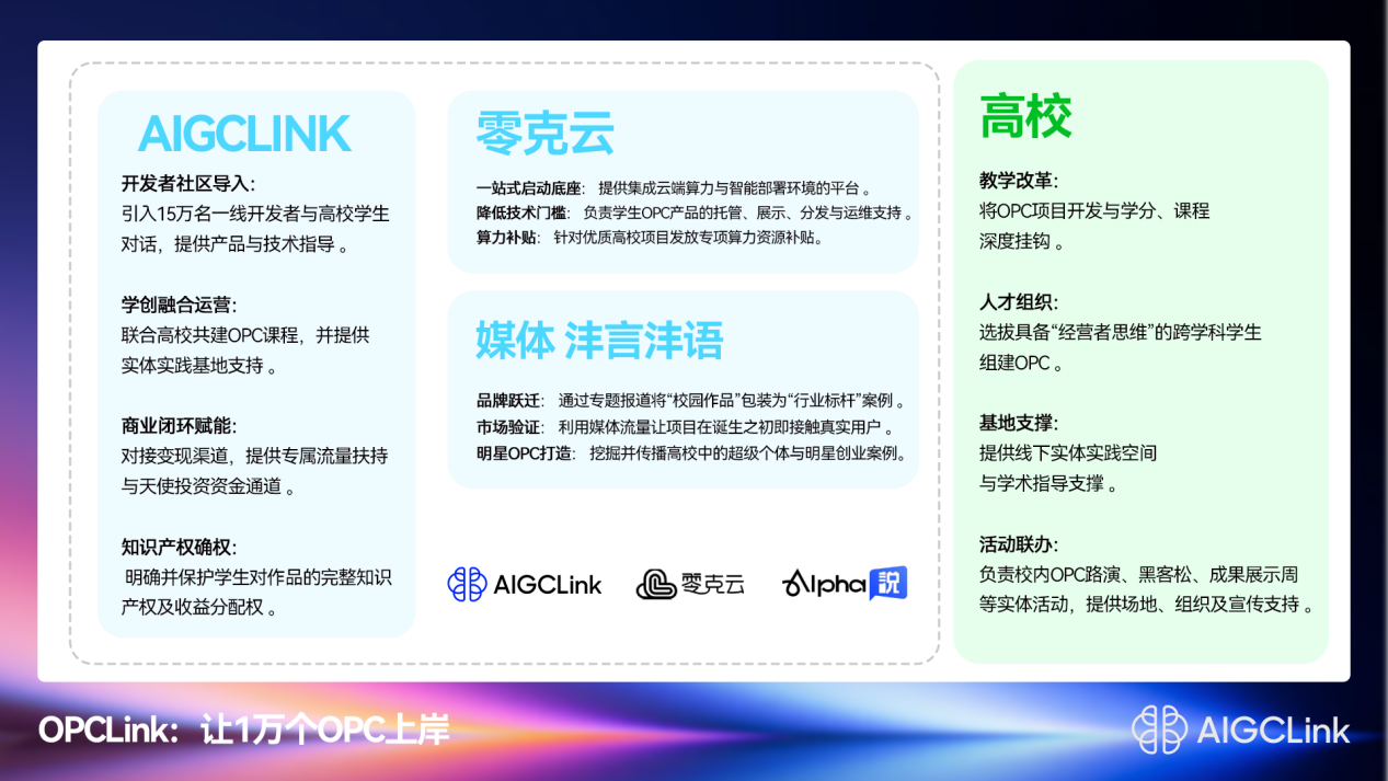 进化是OPC持续成长的道路。“OPC 高校计划”致力于推动一场以“真实创造”为核心的学创融合改革。课程设计与真实项目开发深度绑定,学分与产品迭代进度、用户数据反馈直接挂钩,让市场成为最核心的考官。产业导师将以“创业合伙人”的身份,而非传统讲师,深度介入项目的关键评审与资源对接。这套体系的最终目标,是在确定的合作周期内,成功助推首批学生OPC走通从0到1的全流程,实现稳定营收,完成“毕业即创业”的闭环验证,并将其成功经验沉淀为可复制、可推广的方法论。