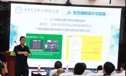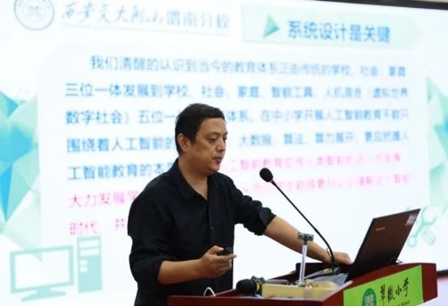西安交通大学附属小学渭南分校执行副校长赵文安则以“在中小学常态化开展人工智能教育的探索”为主题,向与会嘉宾分享西安交通大学、西安交大附小创新港分校智慧学习空间等成果案例的实践情况。他在现场通过实际教具介绍信息科技教育产品逻辑,并在分享中表示,中小学人工智能学习在创新技术的驱动下发生了很大的变化。各地中小学需通过人工智能教育助推人类智能的进一步发展,大力发展学生的“元智能”,应从系统设计、空间学习建设、活动体验、课程体系规划、常态课的设计与实施等多方面入手,促进中小学人工智能教育常态化展开。