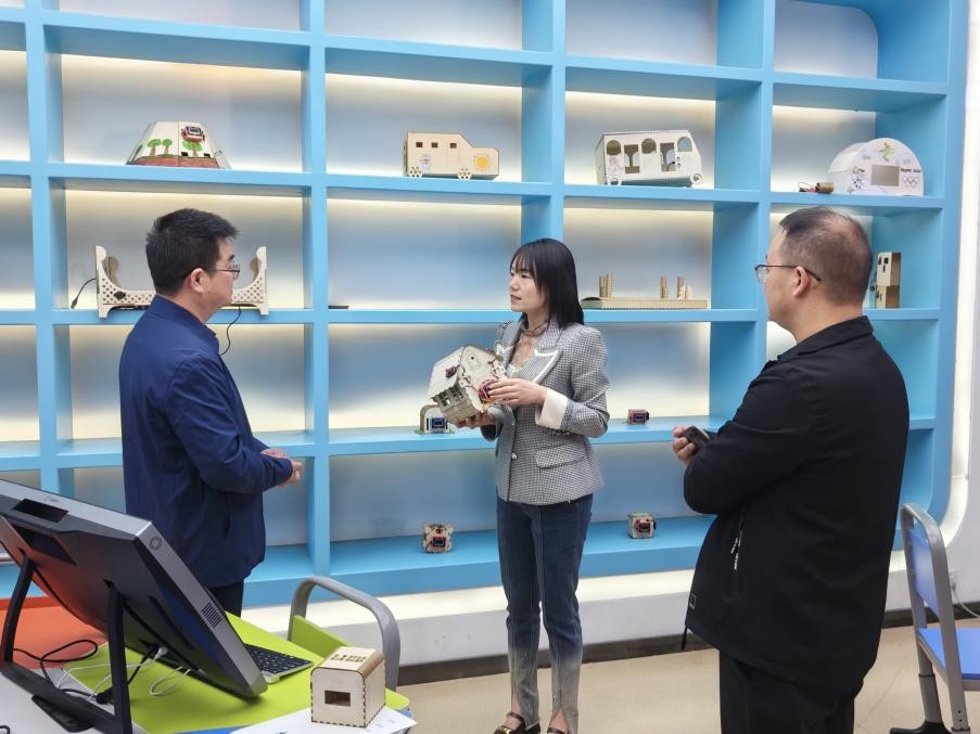 新建的高新少年科学院让考察人员眼前一亮,校长王莉逐一向大家介绍了科学院的鄂飞行研究所、智趣建模与智造中心、智能物联研究中心、创意项目孵化中心、数字语言研究中心等场所。
