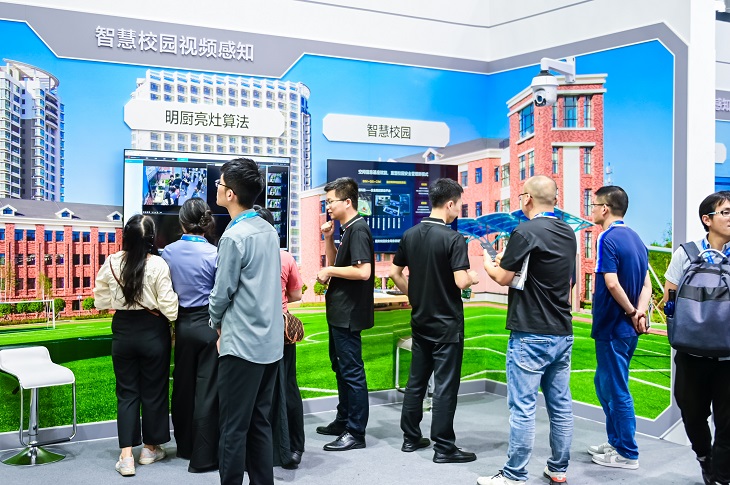 华为着重展示的智慧校园解决方案,基于普惠AI产品组合能力与平台集成能力,整合校园各类应用场景如校园周界、明厨亮灶、出入口人车管理等,打造综合安防解决方案,对智慧校园进行整体规划与设计,切实解决校园建设中的实际问题。