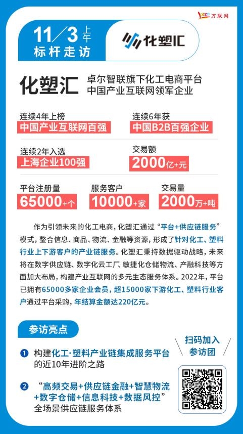 11月3日上午,万联网将携全体课程高管学员,走进卓尔智联旗下化工电商平台、中国产业互联网领军企业【化塑汇】,了解其构建化工·塑料产业链集成服务平台的近10年进阶之路,学习其“高频交易+供应链金融+智慧物流+数字仓储+信息科技+数据风控”全场景供应链服务体系,与其高管交流互动,并建立合作联系。