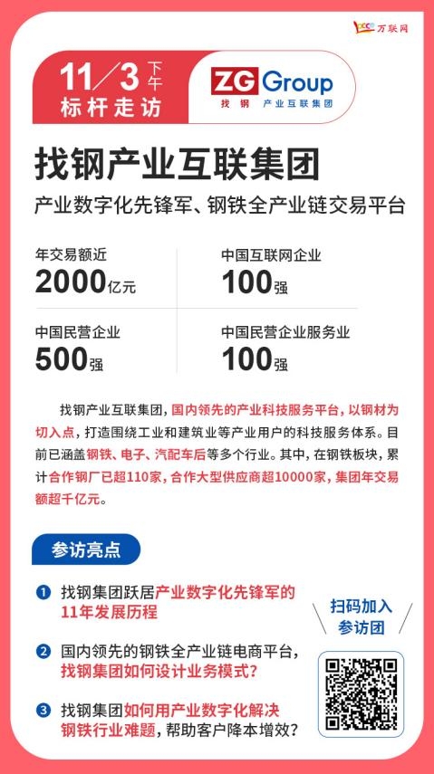 11月3日下午,万联网将携全体课程高管学员,走进产业数字化先锋军、钢铁全产业链交易平台【找钢产业互联集团】,了解其跃居产业数字化先锋军的11年发展历程,学习其钢铁全产业链电商平台运营思路,与其高管交流集团战略布局及业务发展模式,并助力万联研修班高管学员与其建立合作联系。想要加入万联研修班之找钢互联集团参访团的朋友,立即扫码报名,名额有限,满人即止。