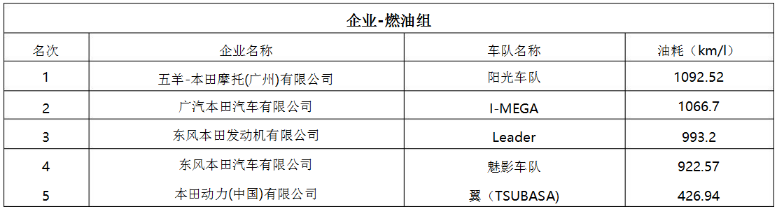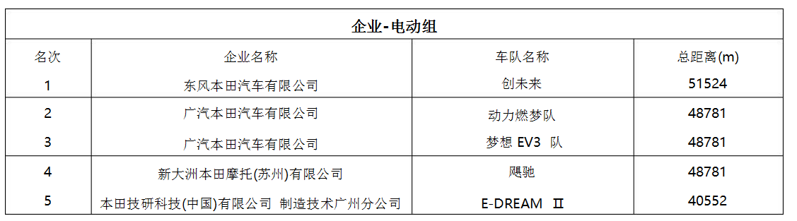 在两天的比赛中,共有来自全国各大高校、Honda 关联企业的近 60 支车队,在燃油车和电动车的两个级别四个组别中进行了激烈角逐。最终燃油车级别的桂冠由吉林大学肯赛节能车队和五羊-本田摩托(广州)有限公司阳光车队,电动车级别桂冠由北京理工大学翼昇 2 队和东风本田汽车有限公司创未来车队斩获。