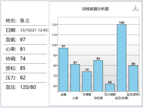系统自动生成心理+生理测评报告,为心理咨询师提供治疗参考。其中包括血氧、心率、协调度、放松度、压力指数、血压六个方面。