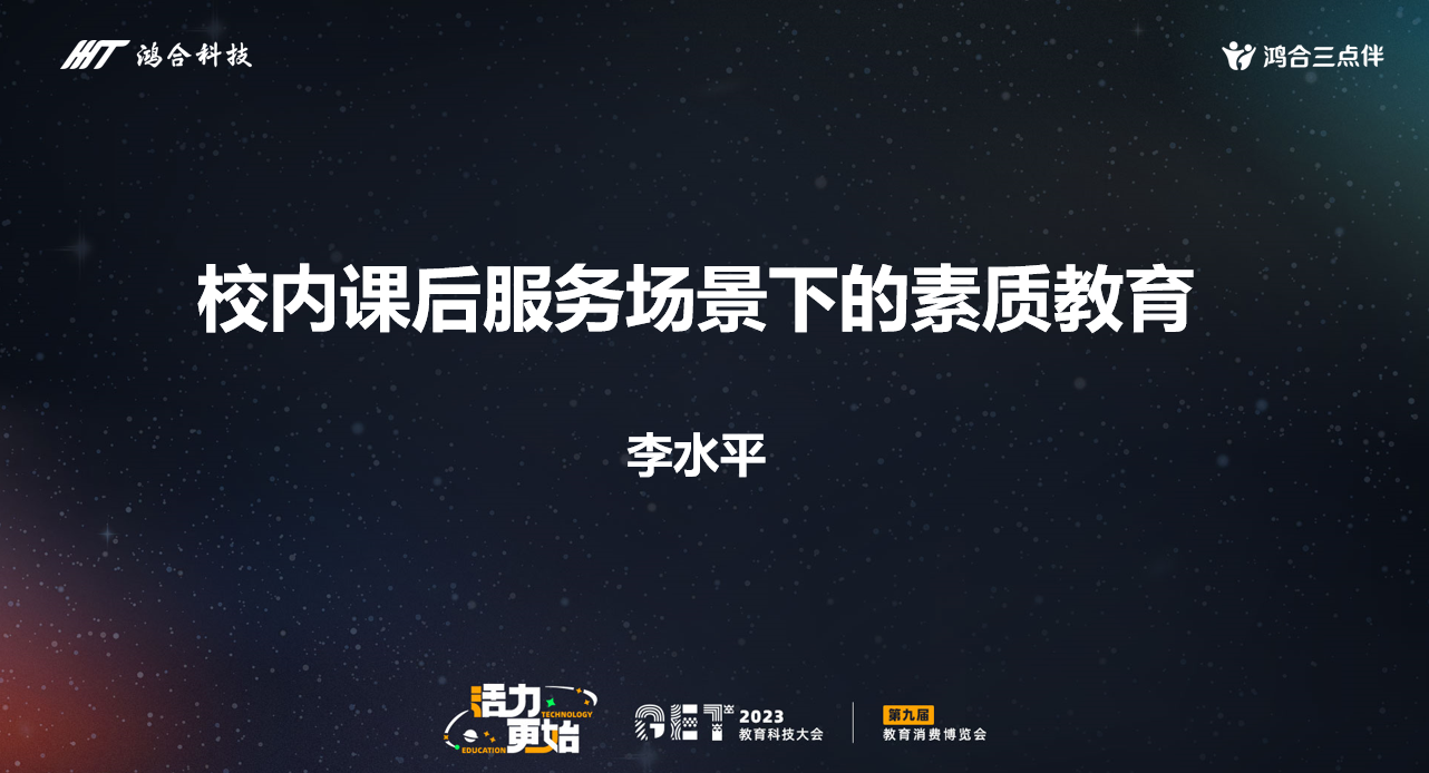 2023年10月17日至19日,芥末堆在北京举办“活力更始•教育与科技的再进一步”GET2023教育科技大会。在18日的素质教育论坛上,鸿合科技副总裁、教育研究院院长李水平博士发表了《校内课后服务场景下的素质教育》主题演讲。