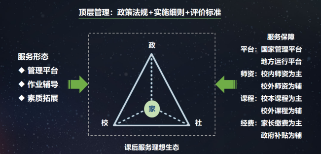 中国中小学课后服务的发展趋势主要有三个方面:一是社会专业服务结构成为校内课后服务的重要补充,二是“平台+课程+服务”的一体化区域统筹方案成为刚性需求,三是科技赋能将推动课后服务管理机制的创新。从全球典型经验分析可以发现,虽然中小学课后服务的主阵地是学校,但要高质量做好中小学课后服务,不能忽视学校与社区的共同配合,也不能全部由国家财政承担全部成本。因此,中国中小学课后服务的未来趋势是构建“政府、学校、社会和家庭”协作生态。