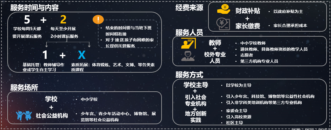 作为一种新型教育活动,中小学课后服务已然成为中国建设高质量教育体系的重要环节,课后服务信息化管理也将成为教育数字化战略行动的重要组成部分。中小学课后服务的时长安排是“5+2”(每周5天,每天课后2小时),服务内容是“1+X”(1小时的辅导作业,1小时拓展素质。其中拓展素质内容包括但不限于锻炼身体提高身体素质、学习音乐美术提高人文素养、阅读经典提高文化素养、开展探究实验与科创实践提高科学素养、组织心理训练提高心理素质,拓展文博与非遗传承提高国学素养等)。服务主体以校内教师为主、校外教师为辅。服务经费可以由地方政府补贴或由政府与家长分摊,也可以全部由家长承担。还明确提出“师资资源与课程资源不足的学校可以适当引入第三方机构入校服务”,但明确要求课后服务里不得讲授新课、不得补课。从政策文件的基本出发点可以发现,中小学课后服务的基本形态应该是素质教育而不是应试教育,即使提高学生的学科能力也应该采用素质教育的方式实施。