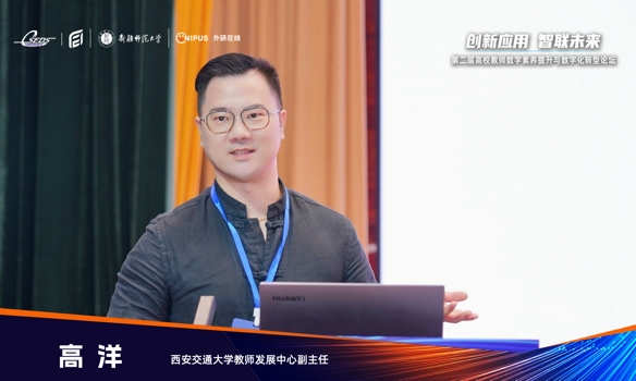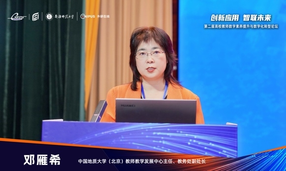 北京外国语大学教务处处长李莉文以“人工智能助推教师队伍建设与新文科教师数字素养提升”为题,分享了院校依托 iTeach开展教师数字素养在线诊断测评、规划教师数字素养提升路径,并通过AIGC辅助教学开展基于教学的新文科教师特色数字化教学创新模式探索经验;中国地质大学(北京)教师教学发展中心主任、教务处副处长邓雁希就“高校教师数字素养‘测—评—培—赛’:创新与实践”展开分享,表示院校依托iTeach构建系统化培训体系,加强数字化教学研究,全面提升教师数字素养,不断推动信息技术与教育教学深度融合,强化教育数字化赋能,提高人才培养质量;华南师范大学教师发展中心主任、教育人工智能研究院常务副院长胡小勇的题目是“智能升级,何以为师——数智化赋能教育高质量发展”,指出在数智时代,教师应及时调整定位、转变思维,学会与人工智能协同共教、共研、共学,指出培养适应数字转型、融合创新的高质量教师队伍是立德树人的重要举措;西安交通大学教师发展中心副主任高洋聚焦“数智时代高等教育中的伦理考量”,系统介绍了依托外研在线AI教师助手在教学提质、科研提效等方面的实践举措,揭示了高等教育中AI伦理研究的发展脉络,强调应建立健全的AI伦理评估机制、关注前瞻性的政策框架并谨慎负责地使用AI技术;新疆师范大学教育科学学院副院长王建虎结合教学实际,分析了“MOOC课程高质量发展的飞轮效应:从因素分析到机制诱发”,指出应以课程吸引力、教师领导力和学生学习力的提升为目标,整合和带动六大关键因素,构成飞轮效应的核心启动力、强化推动力和稳定持续力,最终形成驱动MOOC课程高质量发展三力协同机制;重庆大学教师教学发展中心教学科技与创新部部长李珩通过“信息技术赋能高校教学质量评价与教师发展”,介绍了重庆大学深度融合数字技术与教师发展的创新探索与实践经验,认为应构建知识图谱、融入人工智能等技术,形成“研究—培训—评估”的闭环管理,寻求适合院校自身发展的数字化转型路径。