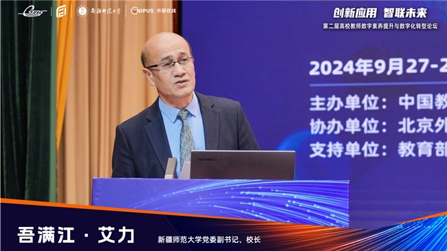 新疆师范大学党委副书记、校长吾满江·艾力代表主办方致辞,向与会领导及专家学者们表示热烈欢迎。他表示,教育数字化是建设教育强国的重要内容,是高校义不容辞的责任和使命。新疆师范大学作为新疆维吾尔自治区重点建设的师范高校,长期以来始终将数字化建设作为高质量发展的重要抓手,大力推进教育数字化转型,持续强化系统设计、课程建设和教师培训,积极探索数字时代教育治理和人才培养新模式。他希望以本次论坛为契机,深入推进国家教育数字化战略行动,重塑高等教育理念范畴,与各位专家学者共同开创数字化人才培养的新局面,为培养更多具有创新精神和实践能力的优秀人才贡献力量。