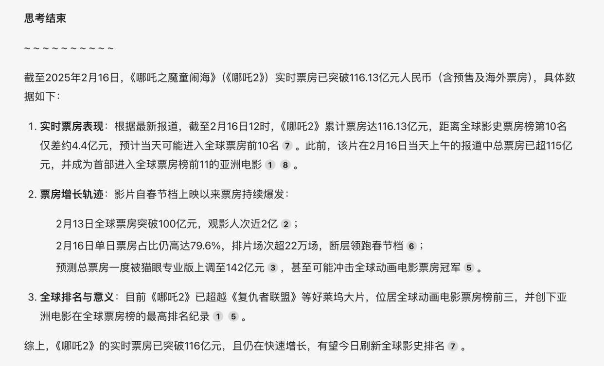 比如我们先启动「联网搜索」,问DeepSeek-R1,“现在《哪吒2》实时票房是多少?”在经过一番「引经据典」后,准确get到了最新数据——已达到116亿人民币,和官方公布的数据毫无二致。