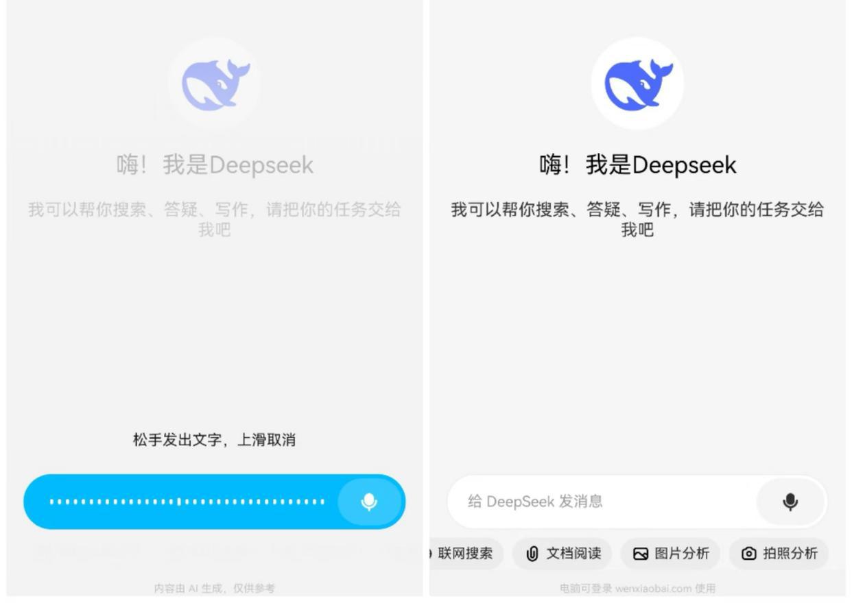 相比原版DeepSeek,问小白上的DeepSeek除了免费,主打的就是不卡、零延迟、不限次、随便用。不仅如此,问小白还实现了“语音输入”,让用户真正实现了和DeepSeek流畅“对话”。