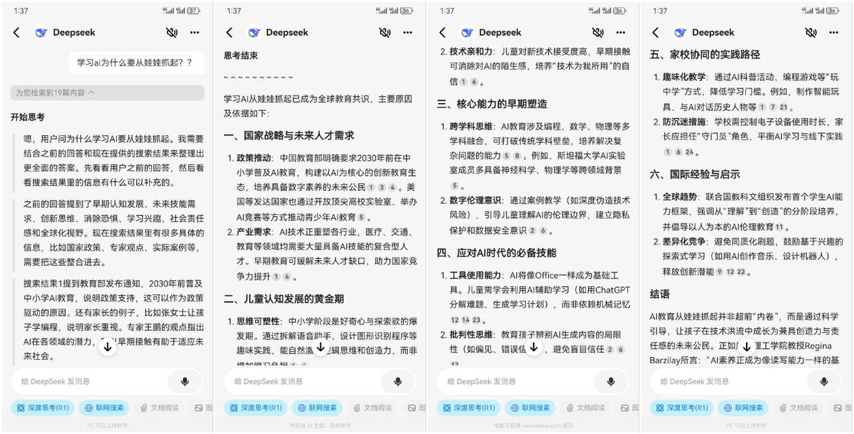 这不,马上开学季到了。我们抓起手机就问了下「学习ai为什么要从娃娃抓起?」。问小白上的DeepSeek-R1通过检索网络后很快就给出了答复。