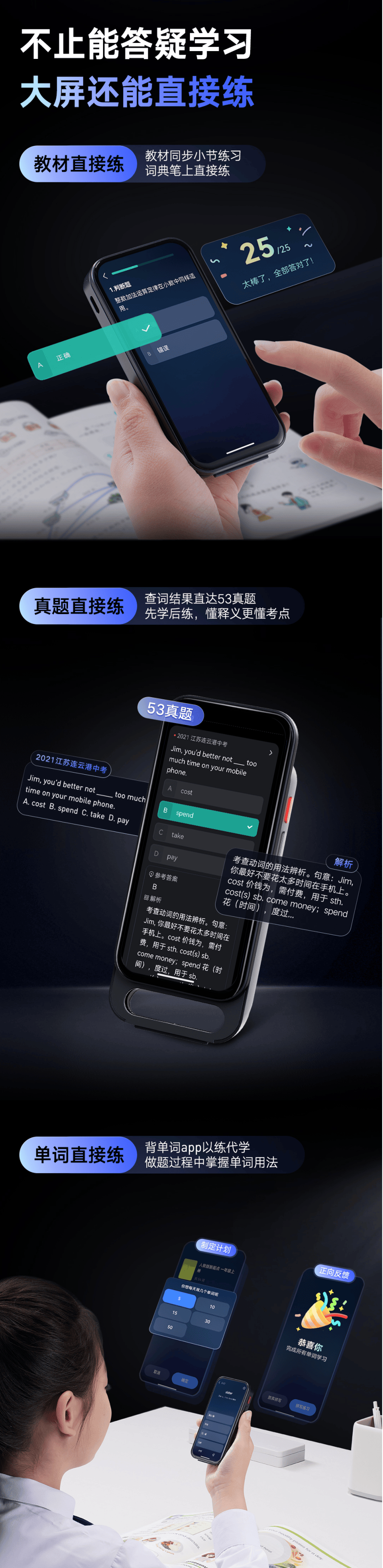 在此基础上,有道SpaceOne适配了小初高权威教辅《5·3》真题等高质量配套练习功能,并利用宽幅全面屏让学生实现“大屏直接练”。无论是教材配套小节练习,还是中高考真题练习、单词记背练习、虚拟人口语私教Hi Echo练口语,学生都可在有道SpaceOne上一站式完成,打通新课标要求下从学到练的高效提升链路。